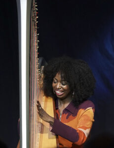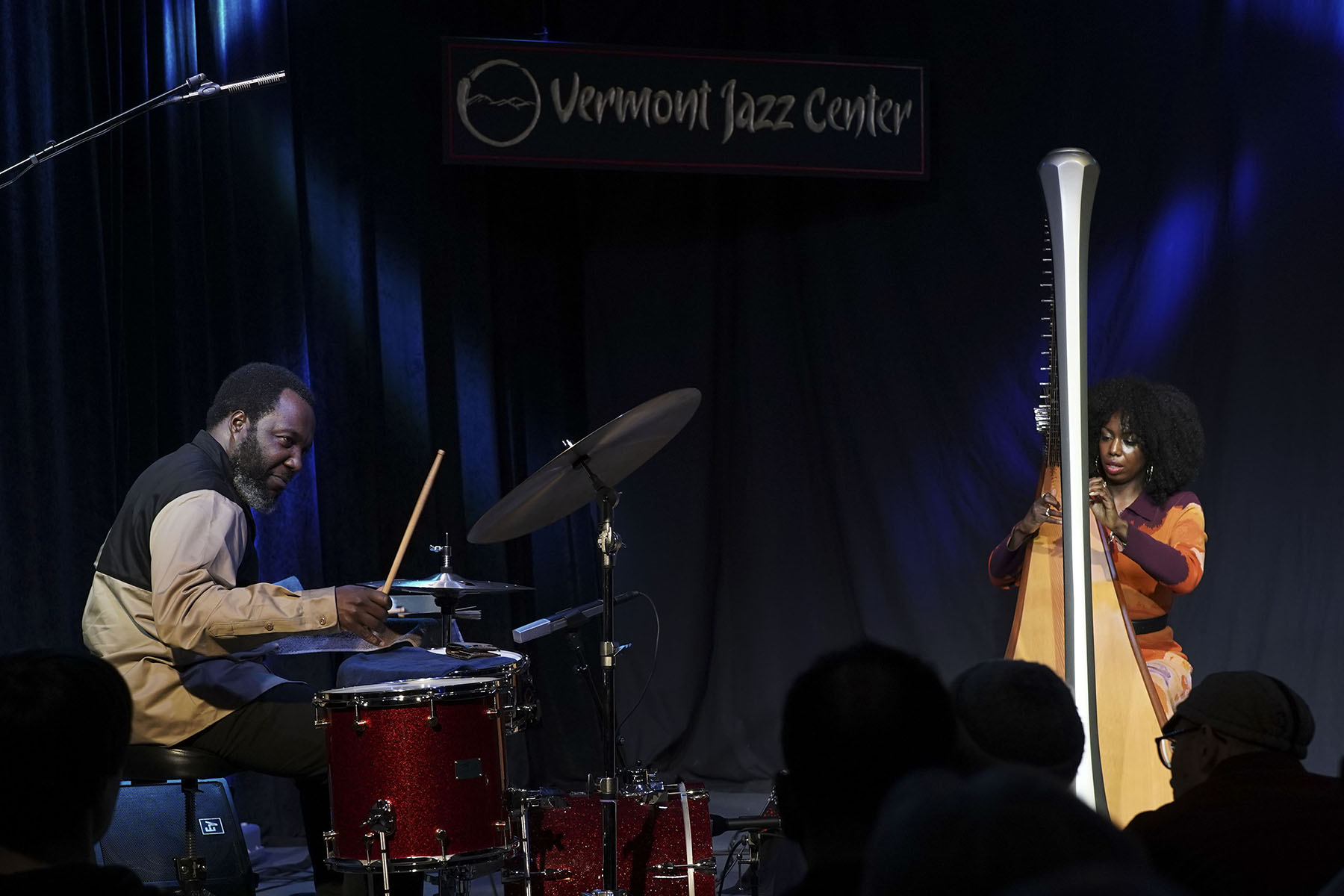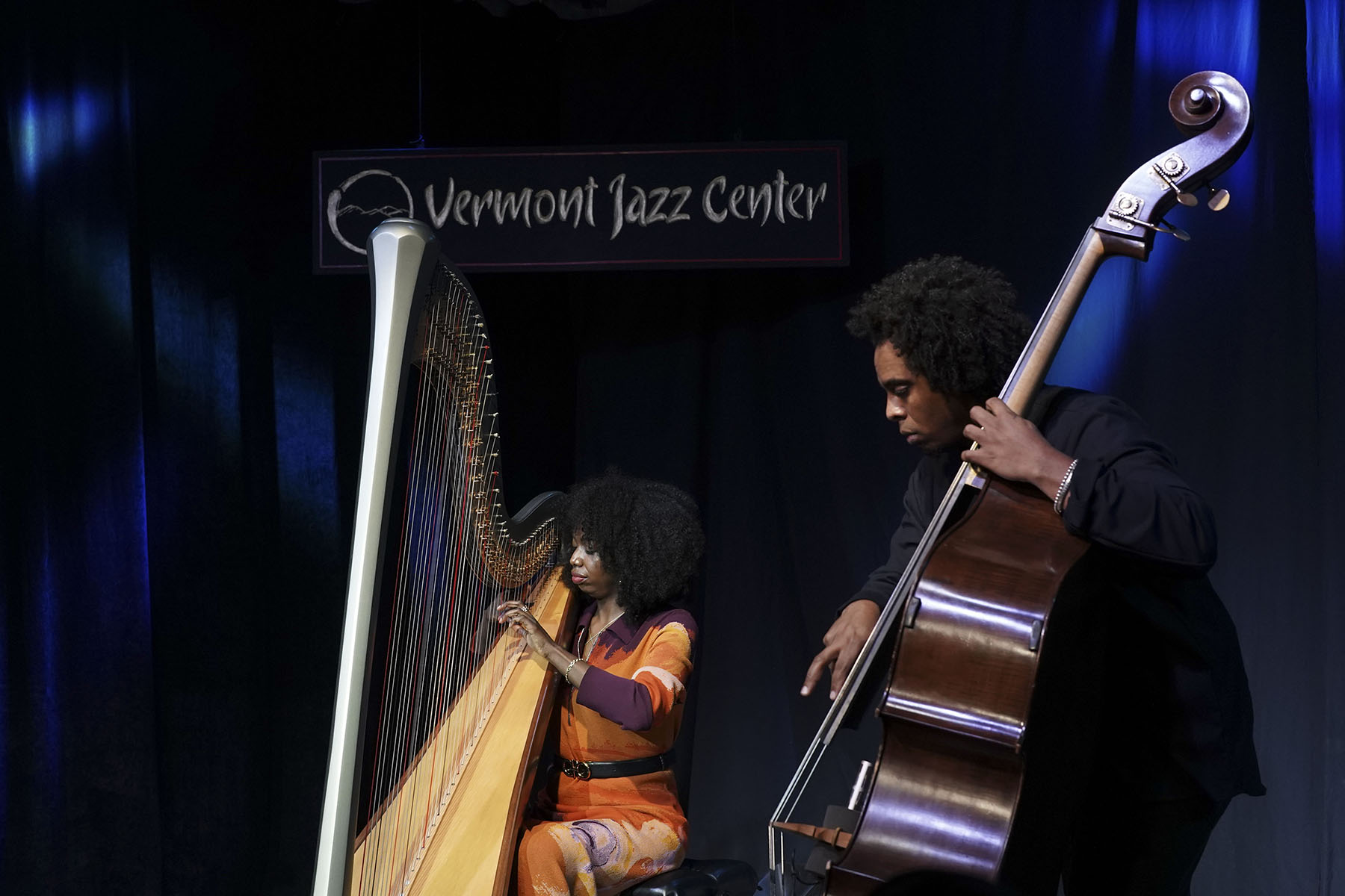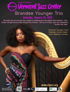The Vermont Jazz Center presented harpist Brandee Younger on January 18th, 2025 with her working trio of Rashaan Carter on electric and acoustic basses, and Allan Mednard on drums. The peripatetic Younger had just returned from a tour where she had traveled from London to Hamburg, from the BRIC Festival in Brooklyn to the University of Michigan, from the Netherlands to Portugal, from Australia to Brussels and beyond.